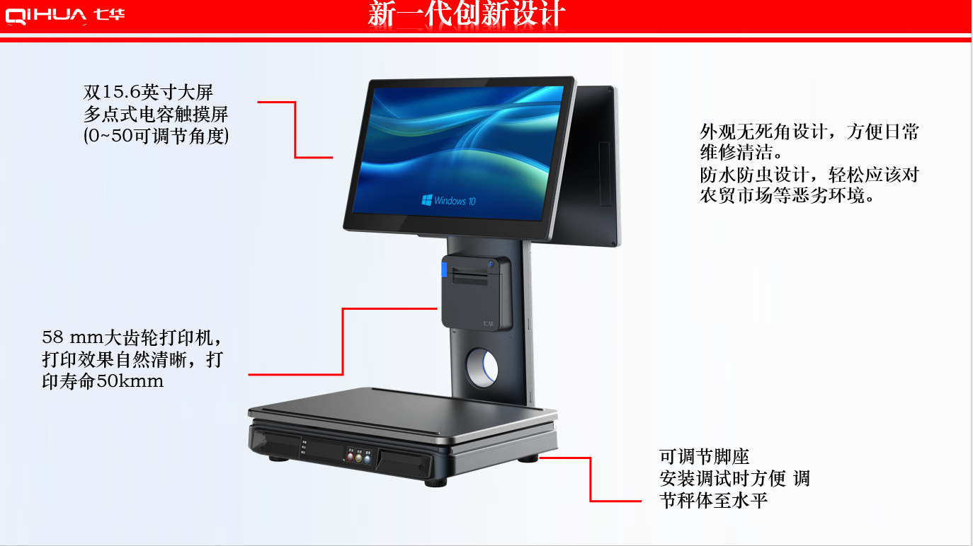 描述:新一代創(chuàng)新設(shè)計(jì),雙15.6英寸大屏,多點(diǎn)式電容觸摸屏可(0~50可調(diào)節(jié)角度)。鋁合金立桿,全新的線倉設(shè)計(jì),輕松藏線,防止線材暴露雜亂。臺面整潔有序。七華自研稱重專利技術(shù),稱重穩(wěn)定、快速;過載保護(hù)設(shè)計(jì),設(shè)強(qiáng)度稱重頻率下也能保持穩(wěn)定準(zhǔn)確;通過國家計(jì)量認(rèn)證, 支持國內(nèi)各地區(qū)檢驗(yàn)要求。外觀無死角設(shè)計(jì),方便日常維修清潔。 防水防蟲設(shè)計(jì),輕松應(yīng)該對農(nóng)貿(mào)市場等惡劣環(huán)境。